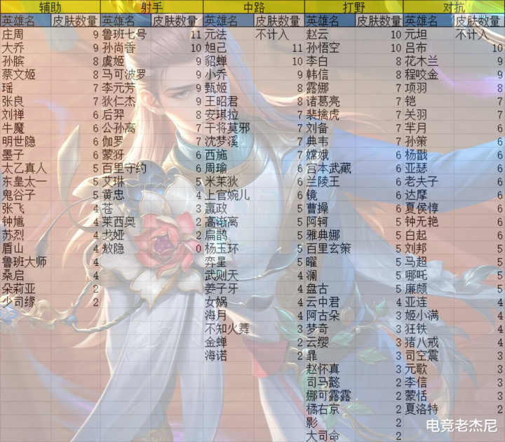 考虑到英雄的发布时间,他们的皮肤分布倒是没有严重偏科,只能说中路这个群体因为有很多小姐姐的加入,女性英雄的皮肤数量会相对更多一些,尤其是那些操作还相对简单一些的英雄